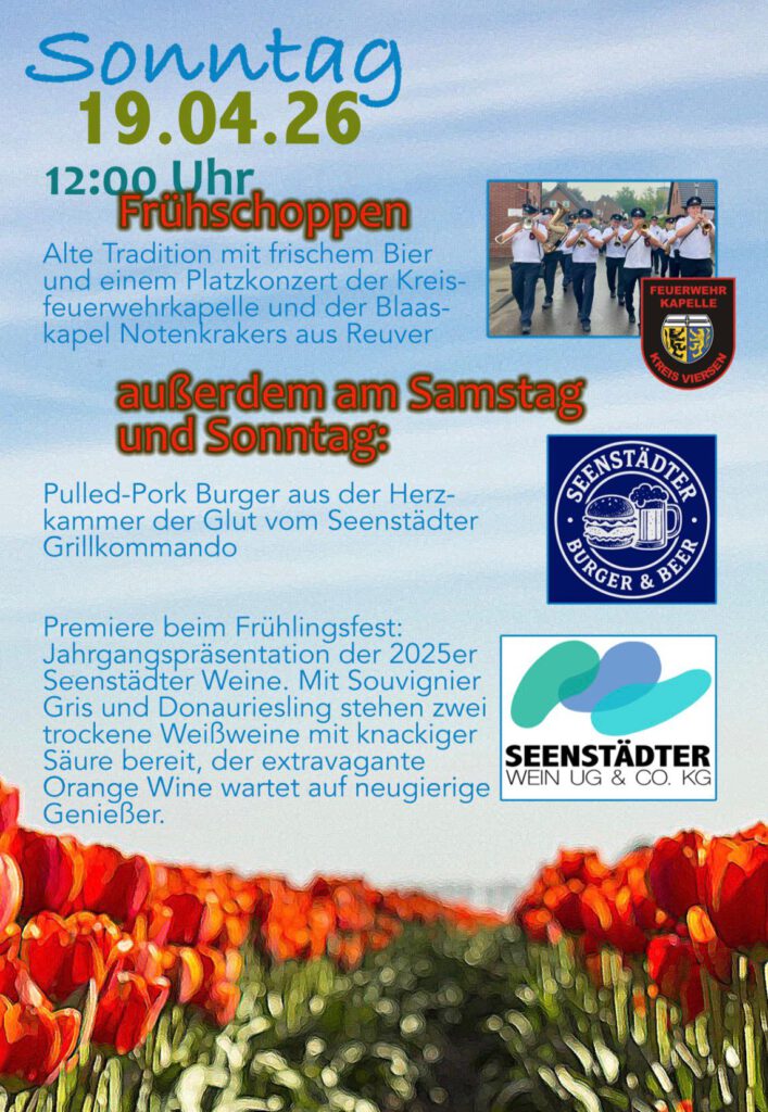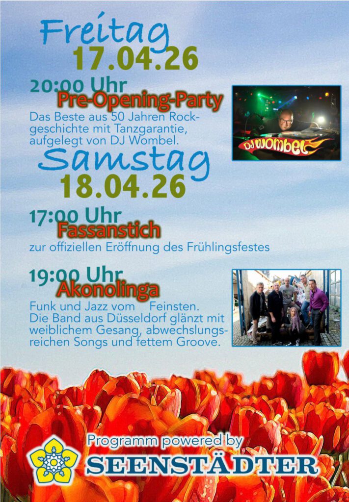 Wir freuen uns auf unser diesjähriges Frühlingsfest zwei Wochen nach Ostern: 18. bis 19. April 2026. Zusammen mit Kirmes (18. bis 21. April 2026), Spring Jam, Seenstädter Farben (schon ab 17. April 2026), Oldtimer Show, Fashion Walk, lecker Essen & Trinken, Kunstausstellungen und schönen Marktständen erwartet uns wieder ein wunderbares Fest!