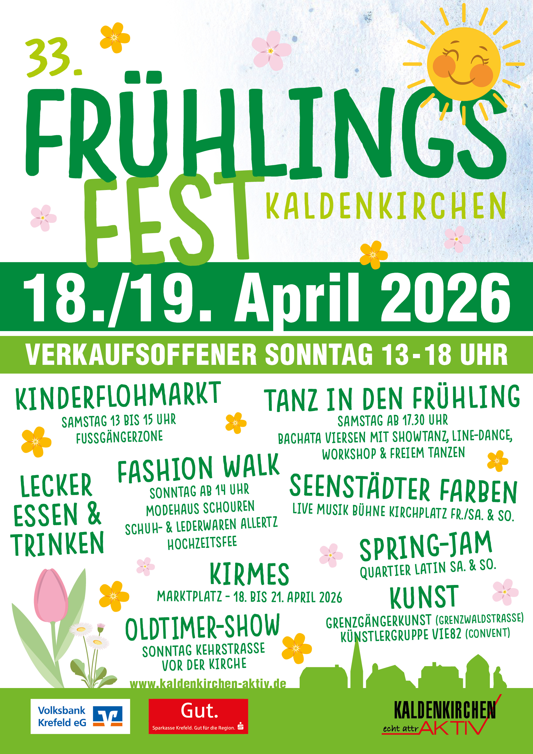 Am Sonntag startet das Frühlingsfest um 11.00 Uhr mit Marktständen und Oldtimershow (neu: Kehrstraße an der Kirche). Ab 13.00 Uhr bis 18 Uhr laden die Einzelhändler zum verkaufsoffenen Sonntag ein. Highlight ab 14.00 Uhr ist der Fashion Walk, eine Modenschau-Kette beginnend vor dem Modehaus Schouren. Im Anschluss präsentiert Schuh- und Lederwaren Allertz nur ein paar Meter weiter Richtung Bürgerhaus die neue Kollektion. Den Abschluss der Shows kann man wieder bei der Hochzeitsfee bewundern.
